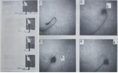除了超聲速飛機(jī)飛行時(shí)會(huì)產(chǎn)生音爆外,還有其他方式也可以產(chǎn)生音爆。例如,馬車(chē)夫甩鞭子催馬快跑,公園里人們甩鞭子鍛煉時(shí)都會(huì)產(chǎn)生音爆(見(jiàn)圖5),不過(guò)這些音爆的影響不大,一般不會(huì)引起人們的關(guān)注。