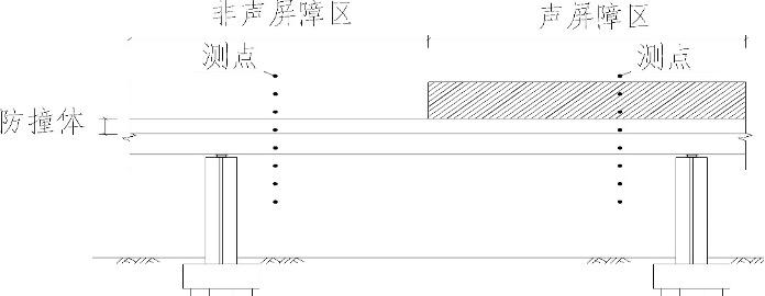 為摸清全市不同高架橋的典型聲屏障插入損失情況,采用GB/T 19884-2005《聲學(xué)各種戶外聲屏障插入損失的現(xiàn)場(chǎng)測(cè)定》標(biāo)準(zhǔn)中要求的間接法,即在裝有聲屏障和沒(méi)有裝聲屏障的不同區(qū)域進(jìn)行測(cè)試,計(jì)算得出聲屏障的插入損失。其中監(jiān)測(cè)段:聲屏障后方豎直方向各布置至少5個(gè)測(cè)點(diǎn);對(duì)照段:在無(wú)屏障開(kāi)闊地帶按照監(jiān)測(cè)段相同方式布置測(cè)點(diǎn)。測(cè)點(diǎn)布置:水平方向間隔不小于2m,垂直方向間隔不小于1m。
