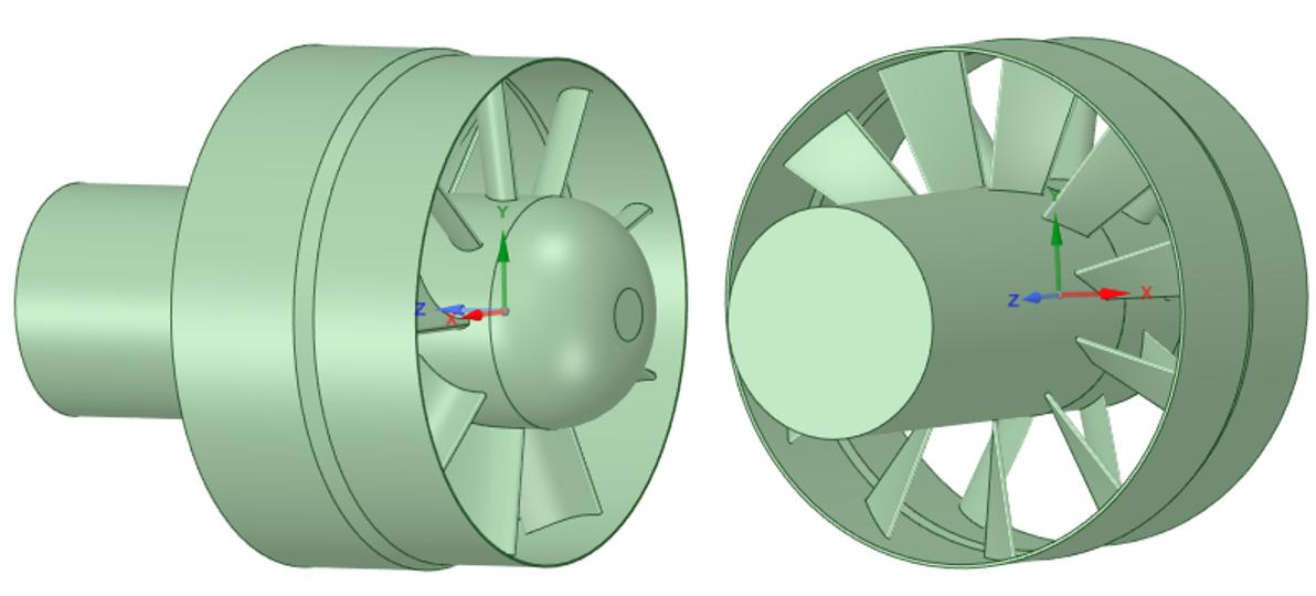 由于現(xiàn)有的泵噴推進(jìn)器模型數(shù)據(jù)鮮有公開(kāi),暫時(shí)無(wú)法分析真實(shí)的模型,因此利用三維建模軟件創(chuàng)建了前置定子式泵噴推進(jìn)器的簡(jiǎn)易模型,如圖3所示,定子葉片數(shù)11,轉(zhuǎn)子葉片數(shù)9,進(jìn)口直徑238mm,槳轂長(zhǎng)度309mm。