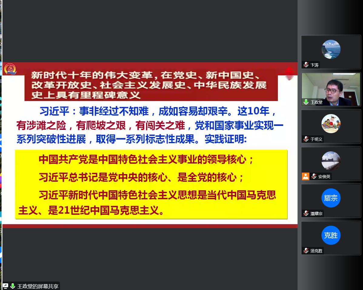 為深入學(xué)習(xí)宣傳貫徹黨的二十大精神,把全站廣大黨員干部職工的思想和行動統(tǒng)一到黨的二十大精神上來,迅速掀起學(xué)習(xí)宣傳貫徹黨的二十大精神的熱潮,12月13日上午,中科院聲學(xué)所北海研究站召開學(xué)習(xí)貫徹黨的二十大精神專題報告會,邀請青島市委黨校黨史黨建部副主任王政堂教授宣講黨的二十大精神,站領(lǐng)導(dǎo)及在職職工共四十余人參加會議。因疫情防控需要,報告會采用線上形式開展。