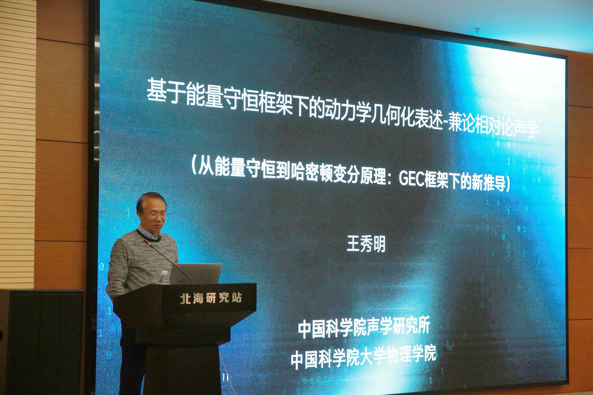 ????王秀明研究員作題為《基于能量守恒框架下的動力學(xué)幾何化表述-兼論相對論聲學(xué)》的報(bào)告。報(bào)告從幾何協(xié)變形式表述的普適能量守恒定律出發(fā),推導(dǎo)出標(biāo)準(zhǔn)的測地線方程或動力學(xué)方程;通過引入共形變換的雅可比度量,將能量守恒本身重新表述為“自由粒子”的測地線運(yùn)動,從而在守恒律和幾何動力學(xué)之間建立了聯(lián)系;報(bào)告還初步討論了該動力學(xué)方程向相對論及相對論聲學(xué)推廣的可能性,試圖在理論物理與應(yīng)用物理的不同領(lǐng)域間建立一些有啟發(fā)性的聯(lián)系。