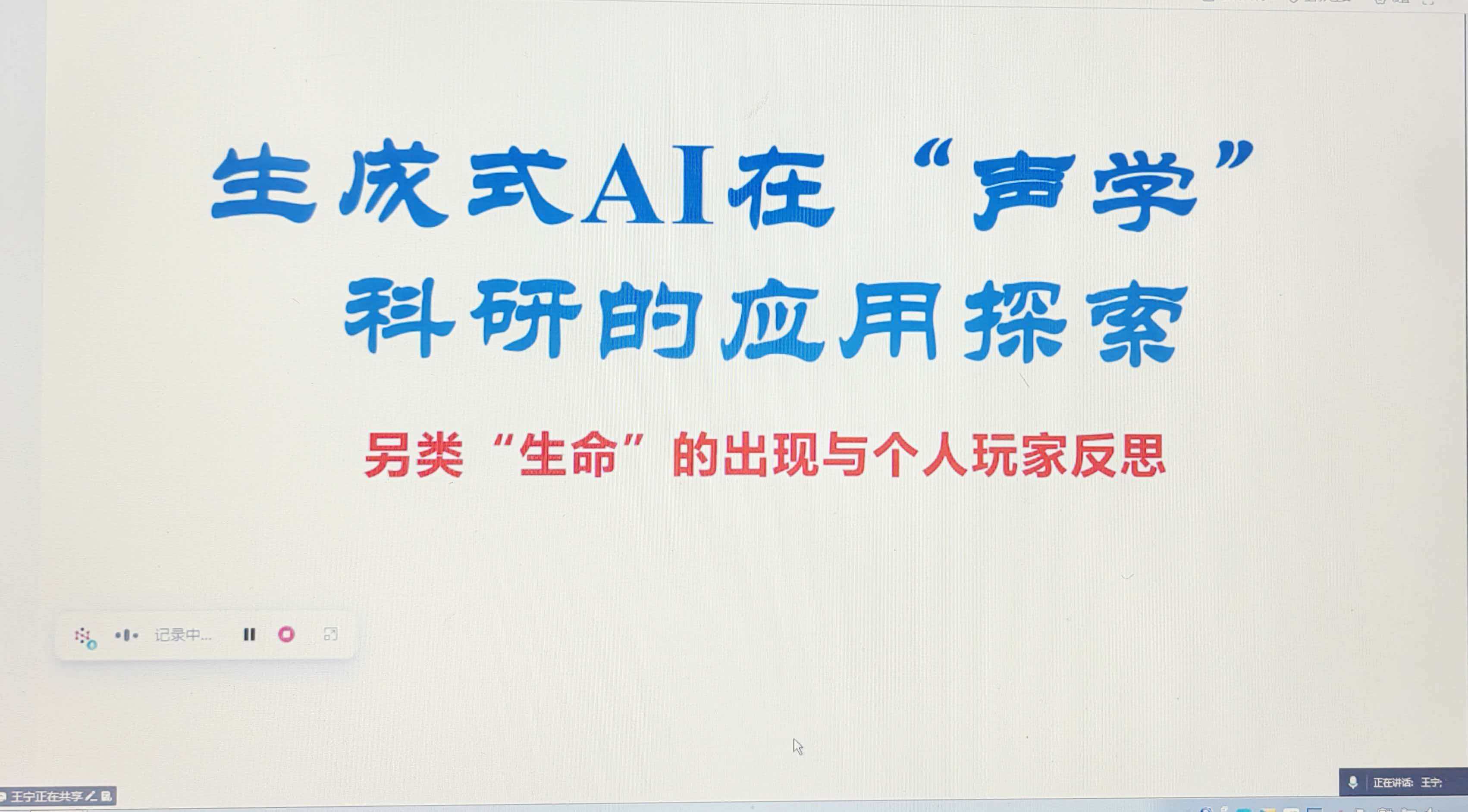 ????王寧教授作題為《生成式AI在聲學(xué)科研上的應(yīng)用探討》的報(bào)告。報(bào)告以水下目標(biāo)探測與識別中的問題為案例,強(qiáng)調(diào)生成式AI 依賴于研究者的有效提示,要通過物理知識約束,進(jìn)一步細(xì)化問題模型,用正確的數(shù)學(xué)描述逐步引導(dǎo),達(dá)到有效利用AI綜合能力的目的;報(bào)告還對未來5-10年,該技術(shù)在聲學(xué)基礎(chǔ)研究與工程應(yīng)用中的發(fā)展前景進(jìn)行了展望。